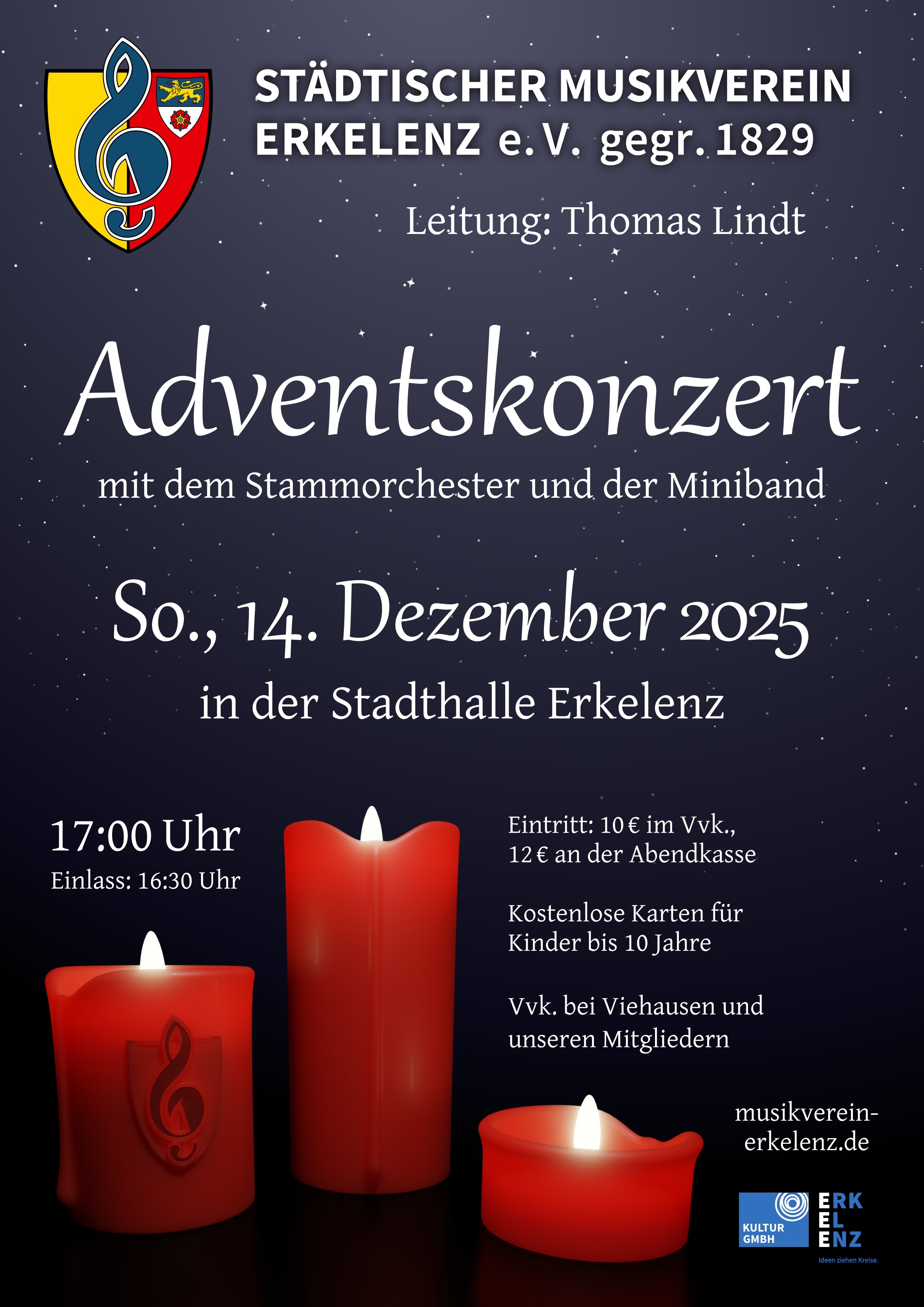 Am 14. Dezember 2025 um 17 Uhr lädt der Musikverein Erkelenz zum Adventskonzert in die Stadthalle Erkelenz ein. Es erwartet Sie ein Programm voller Energie, Emotion und vorweihnachtlicher Atmosphäre.