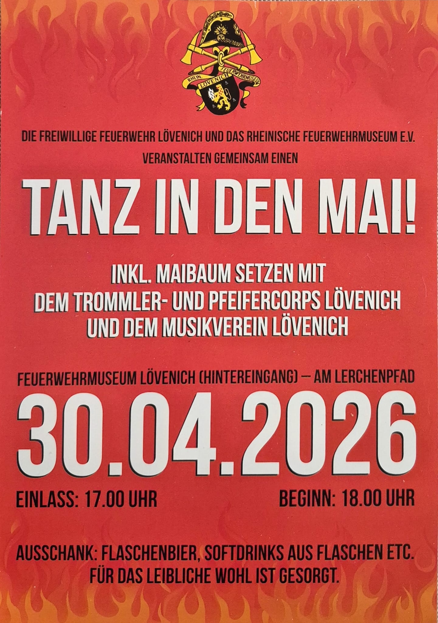 Erkelenz, April 2026 – In Lövenich lädt das Rheinische Feuerwehrmuseum, herzlich zum diesjährigen „Tanz in den Mai“ ein. Die Veranstaltung findet am Donnerstag, den 30. April 2026, auf dem rückwärtigen Gelände hinter dem Feuerwehrmuseum, Am Lerchenpfad, statt.