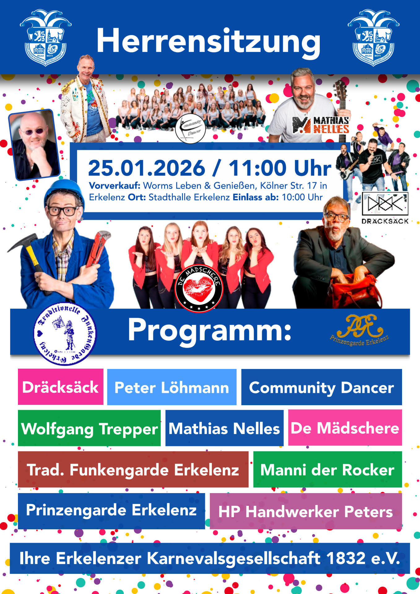 Ab 11:00 Uhr (Einlass ab 10:00 Uhr) treffen sich die Jecken zum karnevalistischen Vormittagsvergnügen für alle Herren. Euch erwartet ein kraftvolles Programm mit Büttenreden, Tanzdarbietungen und Musik – Tradition trifft Stimmung!