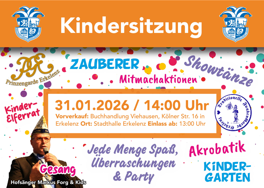 Für unsere kleinen Jecken und Familien gibt es die fröhliche Kindersitzung am Samstag, 31. Januar, 14:00 Uhr (Einlass 13:00 Uhr). Traditionell bieten die Garden der EKG – darunter die Kindertanzmariechen und Jugendgarden – ein buntes Programm mit Akrobatik, Zauberei, Tanz, Musik und tollen Mitmachaktionen.