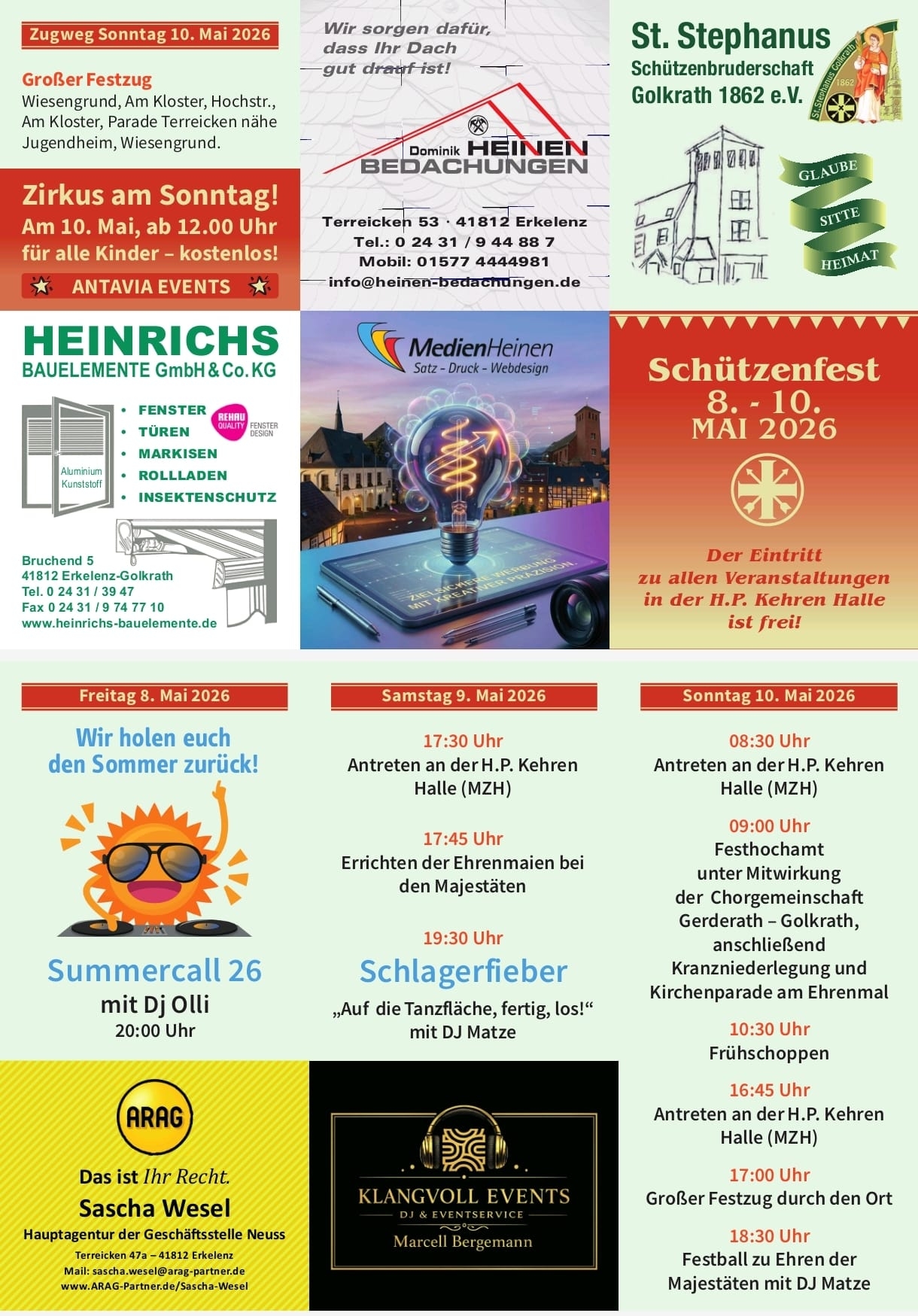 Unter dem Motto „Wir holen euch den Sommer zurück!“ startet der erste Festtag mit dem Summercall 26 in der Mehrzweckhalle. Ab 20:00 Uhr sorgt DJ Olli für beste Partystimmung. Bereits im Laufe des Tages ist die Vorfreude auf das Fest in Golkrath überall spürbar. Die Kirmes ist der Auftakt zu einem Wochenende voller Brauchtum, Musik und geselligem Miteinander im Ort.