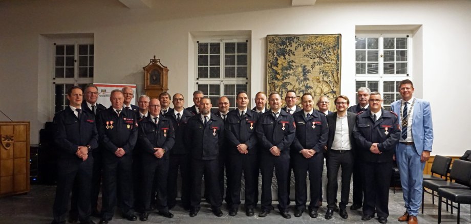 „Über 500 Jahre aktive Dienstzeit kommen bei euch zusammen, das ist ein halbes Jahrtausend Haltung und Einsatzbereitschaft für unsere Stadt“, rechnete Bürgermeister Stephan Muckel während des Ehrungsabends vor und berichtete von einer Begegnung mit einem Jungen auf dem Johannismarkt, der beim vorbeifahrenden Feuerwehrauto ‚seinen Helden‘ staunend hinterherschaute. „Ihr seid Helden“, bekräftigte der Bürgermeister. „Dank euch kann Erkelenz nachts ruhig schlafen.“
