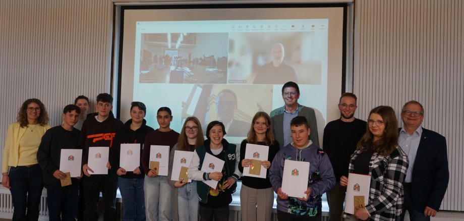 Die Übergabe der Urkunden für diese tolle Leistung übernahm gerne Bürgermeister Stephan Muckel im Großen Sitzungssaal des Rathauses. Schulleiter Markus Monjeamb war erkrankt, ließ sich aber digital zuschalten und vor Ort von seiner Kollegin Stefanie Singer vertreten. Landtagsabgeordneter Thomas Schnelle kam ebenfalls zur Übergabe und gratulierte den Kindern zu ihrem Erfolg. Auch Bundestagsabgeordneter Wilfried Oellers ließ es sich nicht nehmen, zu gratulieren und wurde aus Berlin ebenfalls digital zugeschaltet.
