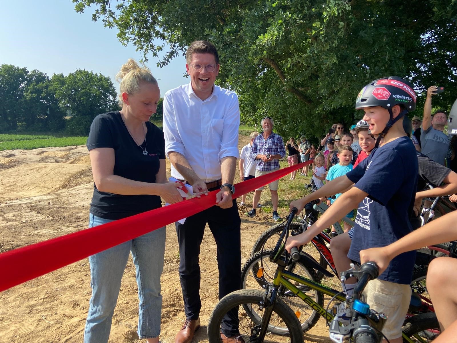 Am vergangenen Freitag, 13. Juni, eröffnete Bürgermeister Stephan Muckel gemeinsam mit Stefanie Vieten von der Elterninitiative Hetzerath die neue Dirt-Bike-Bahn am Sportplatz.