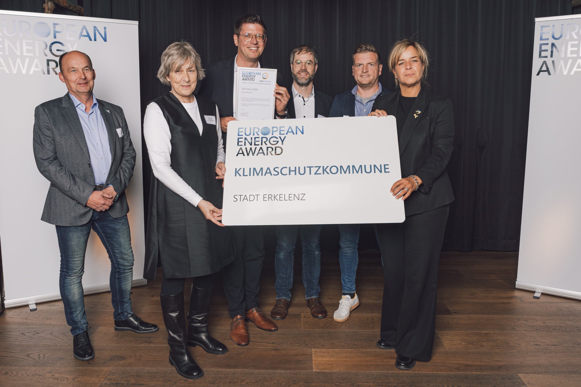 Im Mai 2025 haben Bürgermeister Stephan Muckel, Marcell Breuer (Hauptamtsleitung und Leitung des Energieteams) und der neue Klimaschutzmanager Benedikt Wouters die EEA-Re-Zertifizierung in Düsseldorf entgegengenommen.