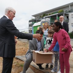 „Die Kita war das letzte Haus aus der Bauxhofsiedlung, wie sie in den 60er Jahren errichtet worden ist. Hier entsteht nun das gleiche innovative Gebäude, wie es gerade in Kückhoven den Nutzerinnen und Nutzern übergeben wurde“, ergänzt Technischer Beigeordneter Ansgar Lurweg. Es sei keine Schande, einen Entwurf zweimal zu verwenden, sondern eine Auszeichnung für den Entwurf und die Menschen, die ihn entwickelt haben. Damit verweist er auf Architektin Saskia Pauli aus dem Architekturbüro Intorp, die erläuterte, dass sich die Kita in der Außengestaltung von der in Kückhoven unterscheiden wird, damit sie sich besser in die Umgebung einfügt. „Die Planung der Kita Kückhoven, die gerade in Nutzung genommen wurde, passt von der Größe und Ausrichtung sehr gut auf das Grundstück am Bauxhof. Wir nutzen somit planerische Synergien aus“, weiß auch Hochbauamtsleiter Martin Fauck.