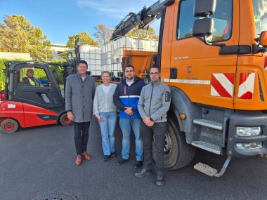 Bürgermeister Stephan Muckel und Bauhofleiter Sebastian Scherm haben die IBC Container bereits Ende 2025 vor Ort in Erkelenz in Empfang genommen.